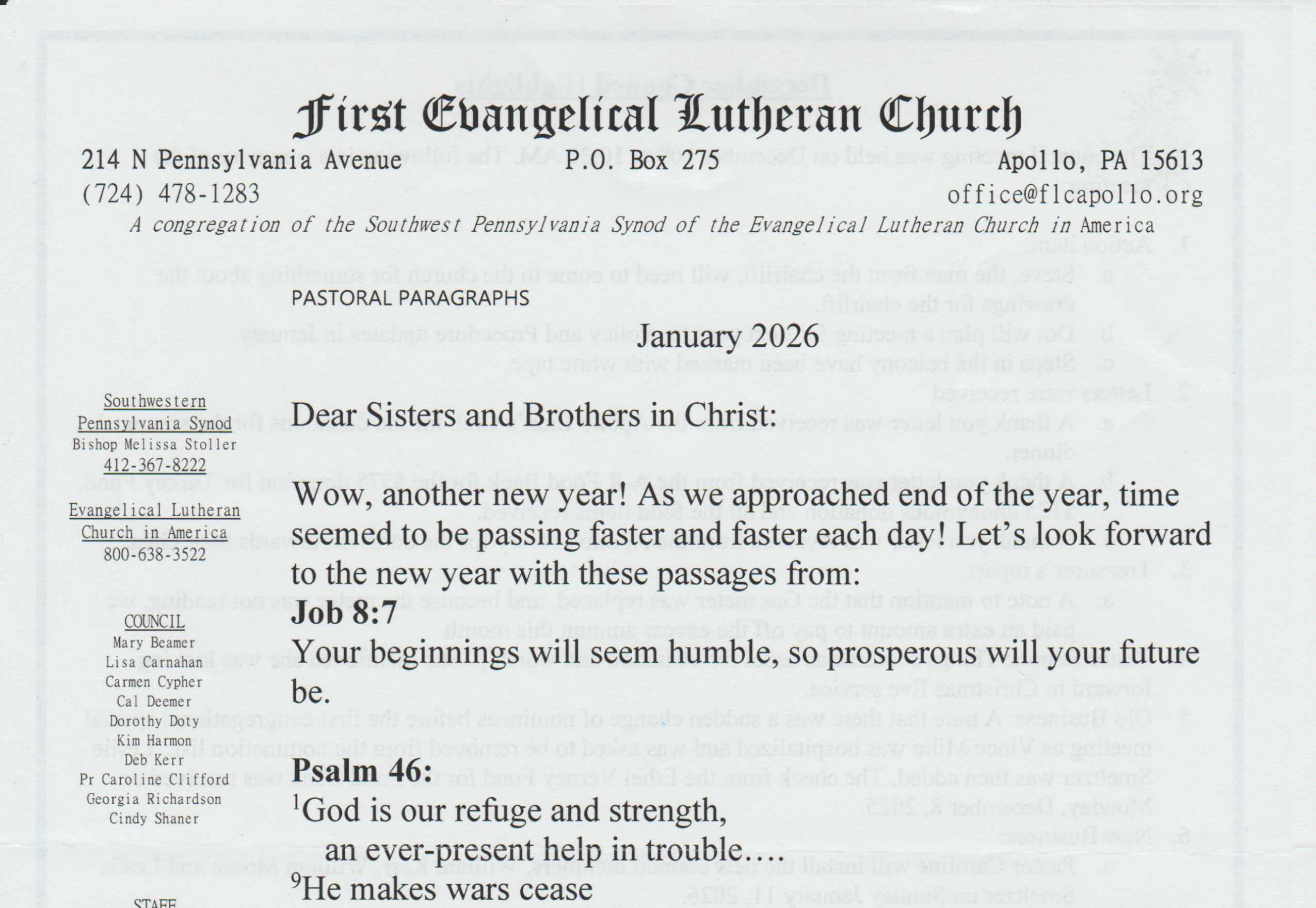 Welcome, and thank you for visiting the website for First Lutheran Church in Apollo, Pennsylvania. We hope you will come visit and continue on your spiritual journey with us.